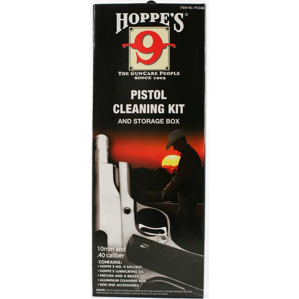 Get everything you need to clean a pistol with Hoppe\'s Pistol Cleaning Kits. These cleaning kits include a one-piece aluminum cleaning rod, a two ounce bottle of Hoppe\'s No. 9 Gun Bore Cleaner, one 2.25 ounce Hoppe\'s Traditional Lubricating Oil, patches, and the cleaning rod accessories to get a pistol clean. The caliber specific kits include a nylon brush, nylon slotted end, and nylon jag. The all calibers kit includes one nylon slotted and three knob ends. Available with a storage box or in disposable packaging.